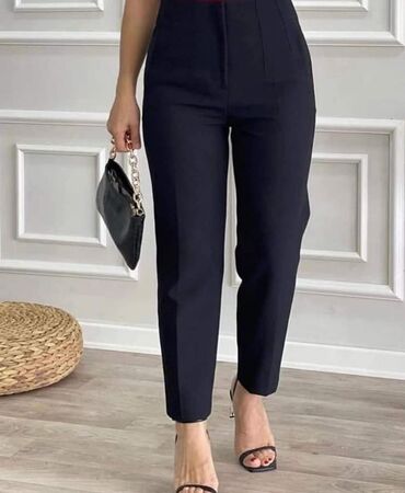 Elegantna ženska kombinacija: svetloplavi bodi i tamnoplave pantalone sa visokim strukom. Bodi: - Boja: svetloplava - Materijal izgled: lagan, lepršav gornji deo sa dugim, blago balon rukavima i e...