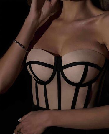Korset šljokice S/M Elegantni crni korset sa šljokicama. - Veličina: S/M - Dizajn: crna čipka sa srebrnim šljokicama raspoređenim u geometrijski V motiv; ukrašene korpe za dodatni sjaj - Model: ...