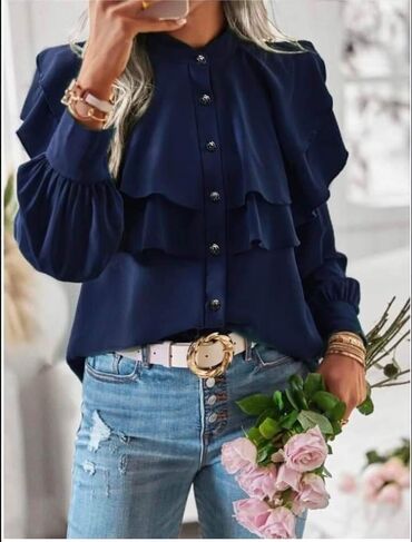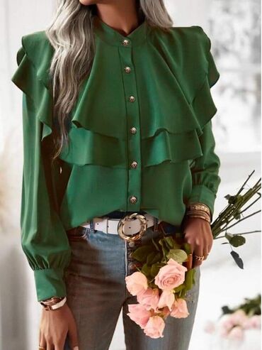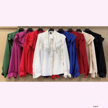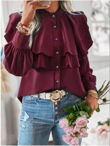 Svilena košulja sa tufnama i ukrasnim mašnama - Materijal: glatka, sjajna tkanina satenskog efekta, prijatna na koži i blago padajuća - Kroj: klasična košulja sa kragnom, dugi rukavi sa širokim ma...