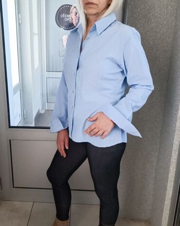 Ženska teksas košulja RE-DRESS, veličina S. - Klasičan kroj sa dugim rukavima - Kopčanje napred niz celu dužinu metalnim dugmićima u boji zlata - Okrugla kragna sa dezenom na sitne tufne (crn...