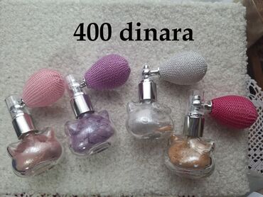 - Shimmer/prah sa raspršivačem u bočici (u obliku mačkice) – više nijansi: roze, ljubičasta, srebrna, zlatna. Za blistav sjaj na licu i telu. Cena: 400 dinara (po komadu, kako je naznačeno na slici).