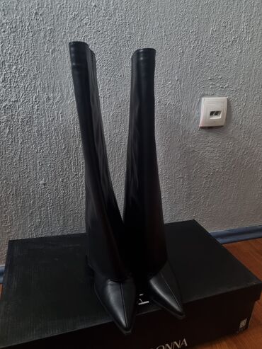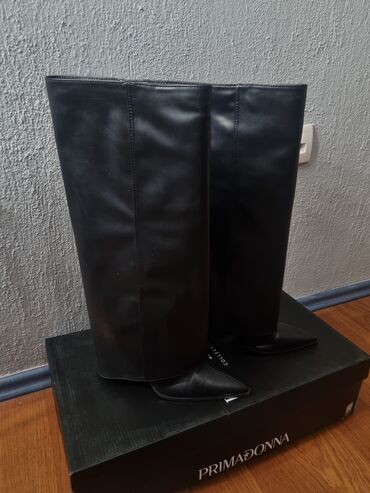 Ženske visoke čizme do kolena, crne. U savršenom stanju, nošene samo po sobi, prodajem zato što su mi male. - Materijal: gornji deo kombinacija glatke eko-kože i elastične tekstilne strane koja ...