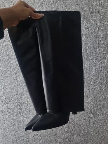Crne ženske čizme preko kolena – Zara - Model: visoke čizme preko kolena - Boja: crna - Materijal gornjišta: glatka veštačka koža (look leather) - Postava: tekstil/sintetika - Đon: gumeni, ravniji...