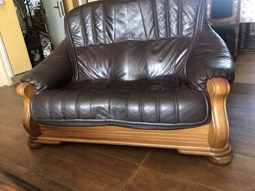 - Prostrana sofa sa drvenom bazom i kožnim jastucima