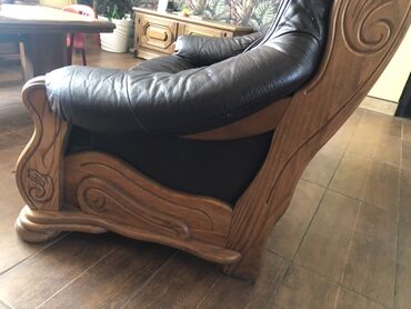 - Detalji izrade: kožni jastuci sa ivicama ojačanim paspulom; profilisani bočni paneli od punog drveta sa ukrasnim urezima; stabilna i teška baza.