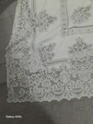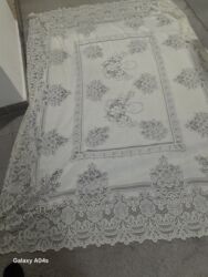 - Elegantni krem stolnjak sa bogatim čipkanim detaljima i floralnim motivima