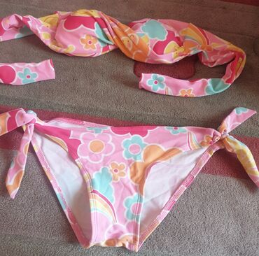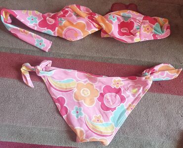 Kupaći kostim dečiji, za devojčice. Iz dva dela. Presladak, roze, cvetni dezen. Gornji deo nikad nošen, donji deo par puta. Oko 8 godina. Sa strane se vezuje, pa se prilagodjava telu, i gornji i donji deo.
