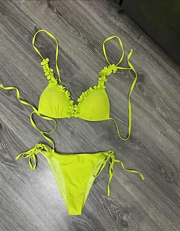 Zenski bikini kupaći kostim brenda Bonatti. Gornji deo je trouglastog oblika sa podesivim trakama koje se vezuju oko vrata i leđa, dok donji deo ima bočne trake za vezivanje, omogućavajući prilagođ...