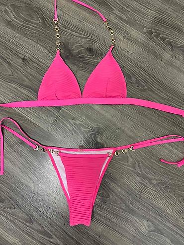 Zenski bikini kupaći kostim brenda Bonatti. Gornji deo je trouglastog oblika sa podesivim trakama koje se vezuju oko vrata i leđa, dok donji deo ima bočne trake za vezivanje, omogućavajući prilagođ...