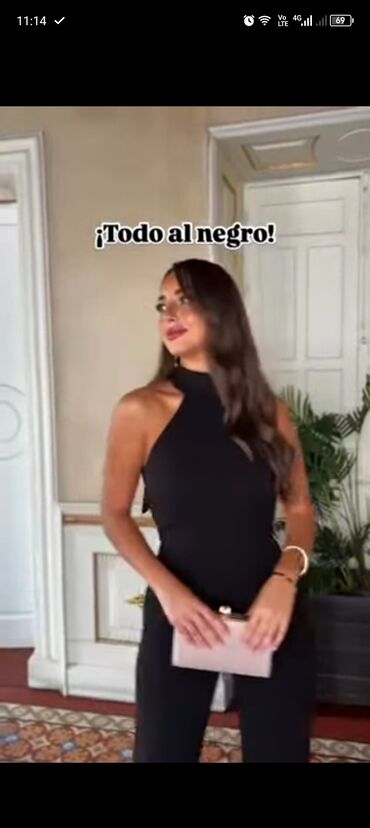 Elegantan ženski kombinezon bez rukava sa širokim nogavicama i V-izrezom. Dizajniran sa širokom kragnom i velikim, ukrasnim dugmadima zlatne boje, koja dodaju sofisticiranu notu. Kombinezon ima pra...