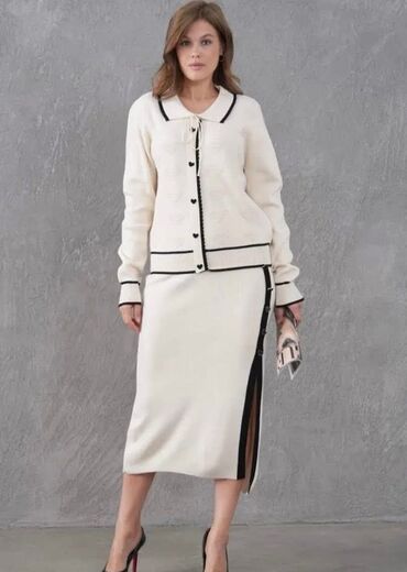Elegantan komplet za dame, plavo-beli džemper sa dugmima i suknja u karo dezen. Novo, moderno, idealno za svaki dan.