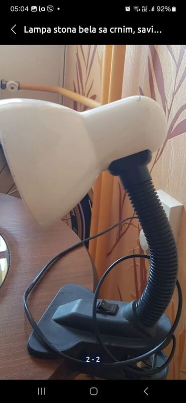 Stona lampaLampa stona bela NOVA sa crnim savitljivim podesivim delim, i stipaljkom, odlicna i vrlo prakticna za svako mesto! Na struju! Koristi standardne sijalice svih jacina!