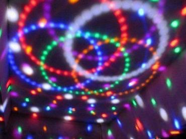 - Višebojni LED svetlosni efekti: kružni i tačkasti uzorci koji se rotiraju i prelivaju po zidovima i plafonu.