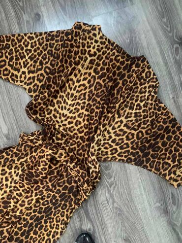 Leopard print haljina od laganog materijala, nije postavljena pa može i za plažu. Dole ima razreze sa obe strane, vezuje se u pojasu ovom maramom a može se nositi i na drugi način, ima miš rukave, komotna, L veličine.