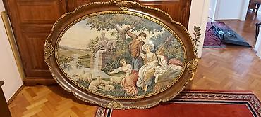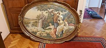 Ručni goblen – buket makova u vazi - Tehnika: klasični ručni vez (krst/bod goblen) na platnu fine gustine - Motiv: raskošan buket crvenih i ružičastih makova u keramičkoj vazi, na stolnjaku sa mek...