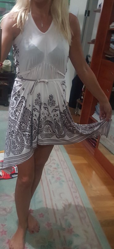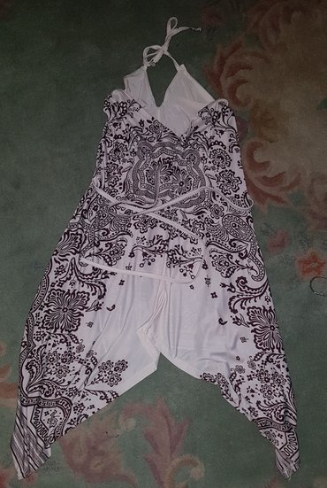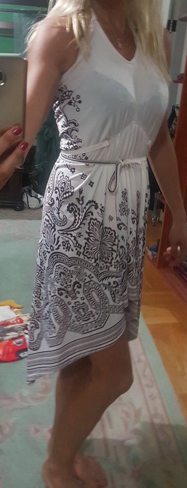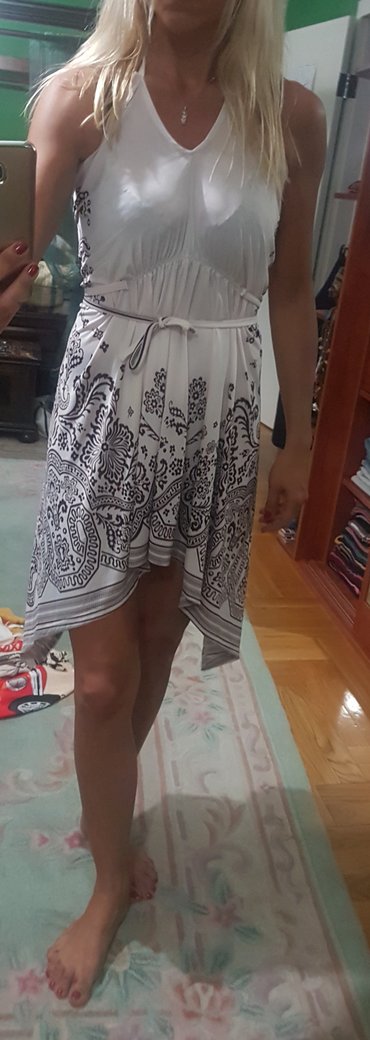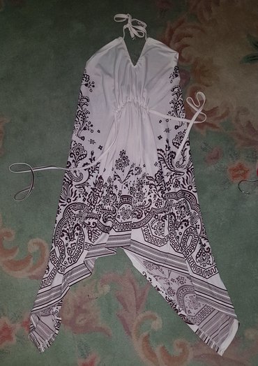 Letnja bela haljina sa braon cvetovima Vezuje se oko struka i oko vrata. Napred i pozadi kraca a sa strane duza. Jako interesantna i lepo stoji. Rasteze se pa mislim da moze i m. Nova