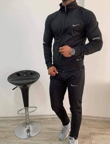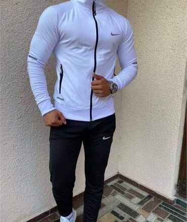 Muška trenerka brenda Lacoste, u kombinaciji tamnozelene, crne i bele boje. Gornji deo je jakna sa rajsferšlusom i visokom kragnom, dok donji deo čine crne pantalone sa elastičnim ranflama na nogav...