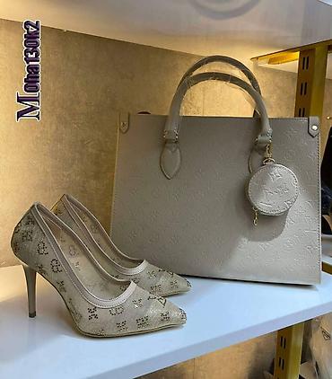 - Cipele: špic salonke sa visokom tankom potpeticom, mrežasti gornjište sa sjajnim aplikacijama i monogramskim motivima, glatke ivice oko risa za udobnije prijanjanje. Potpetica vizuelno izdužuje nogu, pogodna za svečane i poslovne kombinacije.