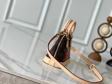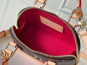 - Boje: braon monogram, bež kožni detalji, crvena unutrašnjost, zlatni metal, motiv trešanja u roze/crvenim nijansama.