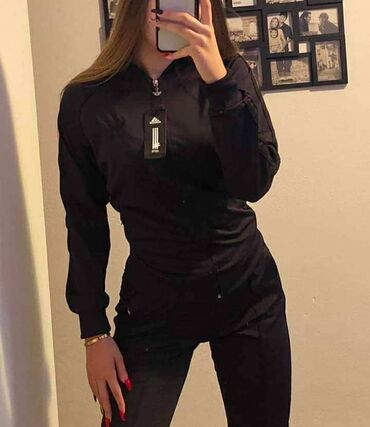 Crni ženski komplet – veličina S - Dvodijelni set: dukserica dugih rukava + donji deo sa elastičnim pojasom i učkurom - Materijal: mekana, prijatna trenerka tkanina - Kroj: opušten gornji deo, rav...