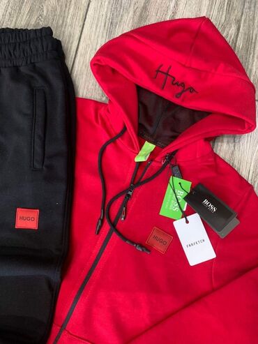 Muška sportska trenerka, koja se sastoji od gornjeg dela u crvenoj boji i donjeg dela u tamnoplavoj boji. Gornji deo je duks sa kapuljačom i patent zatvaračem, dok je donji deo trenerke sa ranflom ...
