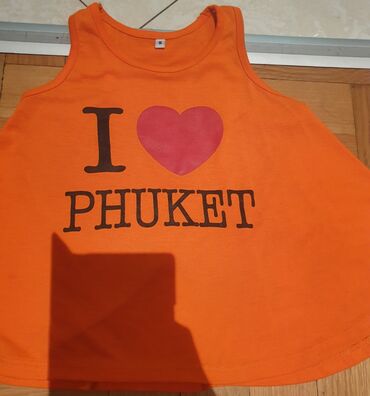 Majica sa Tajlanda I LOVE PHUKET Thailand. Neon narandzaste boje, oko 4 godine. Ponegde neka buckica, i ima par fleka pozadi pri dnu , ne znam odakle, sad sam videla.