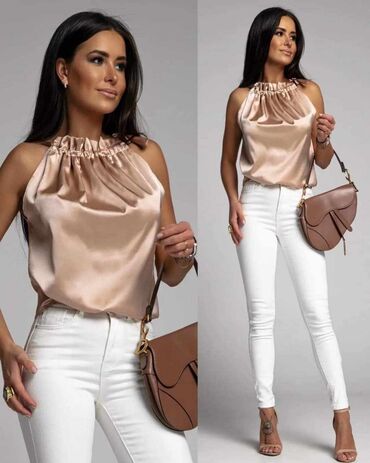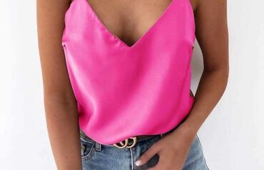 Ženska top majica bez rukava, model halter. - Boja: svetlo roze sa diskretnim prugastim (rebrastim) teksturnim uzorkom - Kragna/vezivanje: halter stil sa tankim naramenicama koje se spajaju iza vr...