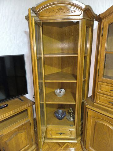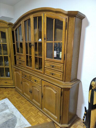 - Dvodelna konstrukcija: donji deo sa komodama i gornji deo sa staklenim vitrinama.