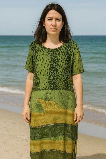 Zenska duga haljina u dva sloja, gornji sloj kraci, ispod duzi. Pojas za vezivanje pozadi. Kao nova