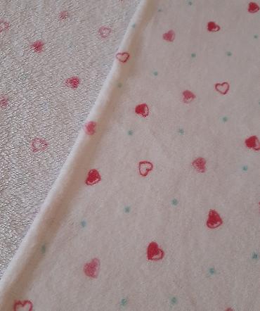 - Dizajn: beli osnov sa sitnim ružičastim srcima i diskretnim tirkiznim tačkicama; zaobljeni ćoškovi i obrađena ivica