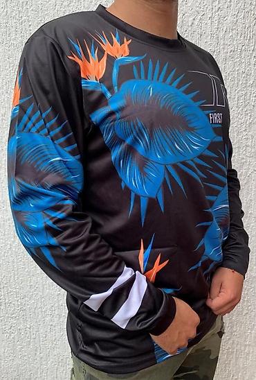 - Dizajn: veliki grafički print preko celog prednjeg i bočnih delova – plavi listovi sa narandžastim akcentima; bele pruge na podlakticama