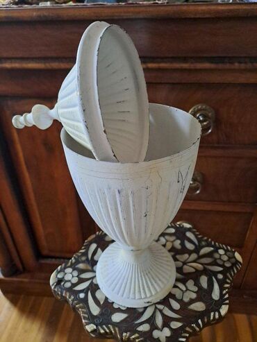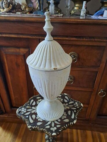Pokupiti na licu mestaMesingana posuda ofarbana u belo. Visina sa poklopcem 36cm i sirina 13cm.