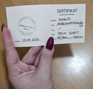 - Priloženo: sertifikat garancije kvaliteta (datum 03.03.2023; model: Minđuše; opis: belo zlato 585/1000, kamen: cirkoni)