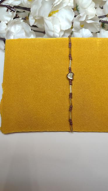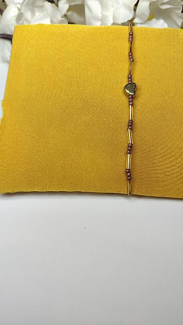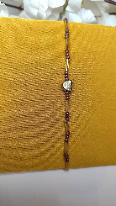 - Dizajn: niz zlatnih cevčica kombinovan sa sitnim okruglim perlicama u toploj, ljubičasto-braon nijansi; u sredini metalni zlatni privjesak – malo srce sa zaobljenim ivicama.