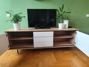 Komoda poseduje 2 vrata i 3 fioke na push sistem otvaranja.