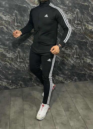 Muški komplet trenerke (gornji deo sa kapuljačom + donji deo) - Dizajn: sportski set sa tri pruge i logotipom na grudima, rukavima i butini. - Gornji deo: dukserica sa rajsferšlusom celom dužinom,...