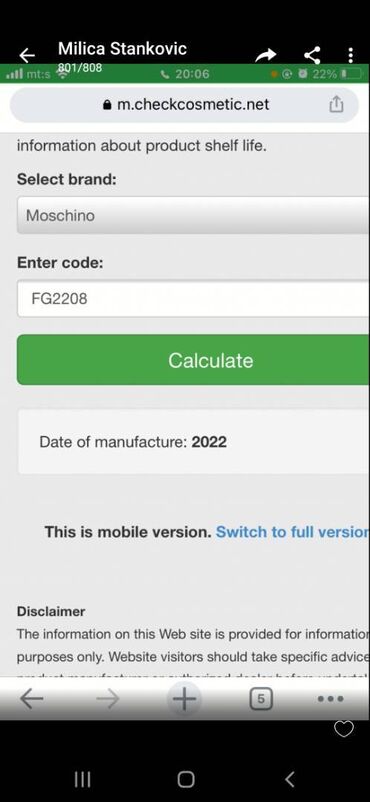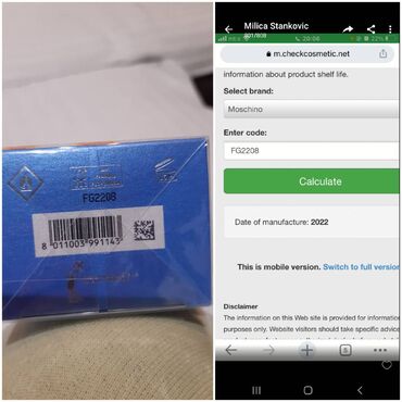 - Serijski/batch kod: FG2208 (na dnu bočice i na kutiji); godina proizvodnje: 2022 (priložen screenshot provere).