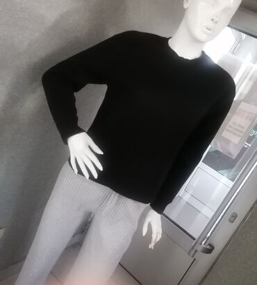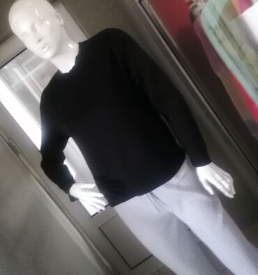 - Gornji deo: crna majica dugih rukava, okrugli izrez, jednostavan i klasičan kroj.