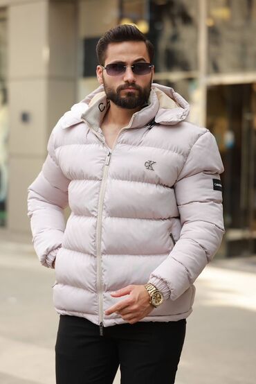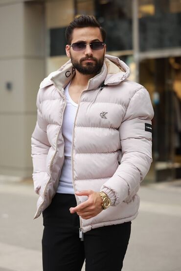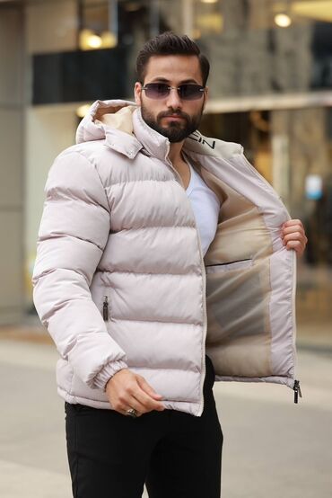 Muška zimska puffer jakna u svetlo bež nijansi.