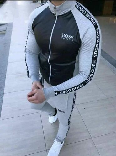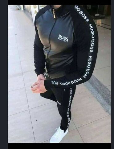 🔥Muški komplet trenerke – gornji deo sa rajsferšlusom i donji deo uskog kroja. Brendirani detalji “BOSS HUGO BOSS” duž rukava i nogavica, kao i logo na grudima i butini. Prednji panel jakne u crnoj, glatkoj tkanini sa laganim sjajem; rukavi i bočni delovi u kontrastnoj boji. Elastične ranfle na rukavima i struku, visoka kragna, funkcionalan centralni zip. Donji deo sa elastičnim pojasom i uskim nogavicama.