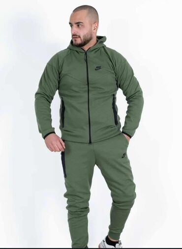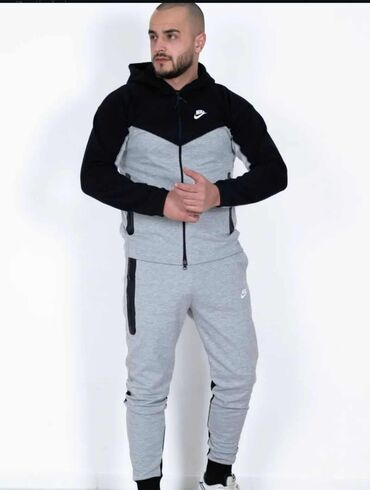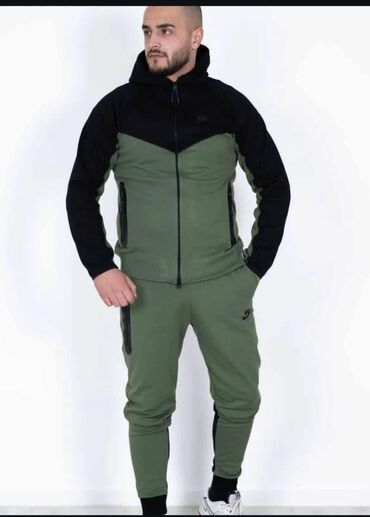 Muška trenerka dostupna u tri varijante boja: maslinasto zelena sa crnim detaljima, siva sa crnim detaljima i potpuno crna. Trenerka se sastoji od dukserice sa kapuljačom i dugih nogavica. Dukserica ima rajsferšlus po celoj dužini i dva bočna džepa sa rajsferšlusom. Donji deo trenerke ima elastičan pojas, dva bočna džepa i dodatni džep na butini, svi sa rajsferšlusom. Elastične ranfle na rukavima i nogavicama obezbeđuju udobno pristajanje. Idealna je za svakodnevno nošenje, sportske aktivnosti ili opuštanje kod kuće. Vidljiv je Nike logo na gornjem i donjem delu, što ukazuje na autentičnost brenda.