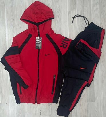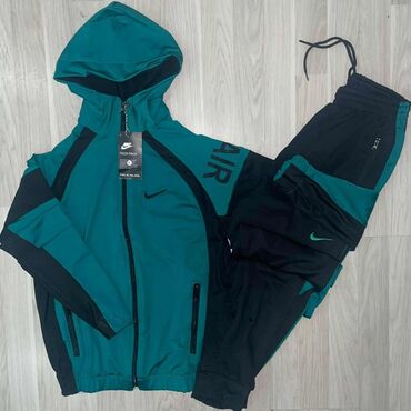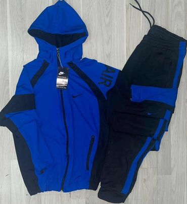 Muški komplet trenerki – dva modela 1) Nike komplet: - Gornji deo na rajsferšlus, visoka kragna - Boje: crna sa plavim ramenima i belim detaljima/linijama - Diskretni Nike Swoosh logotipi na jakni...