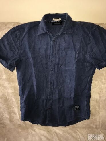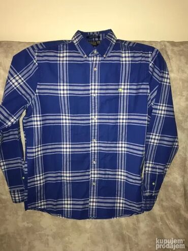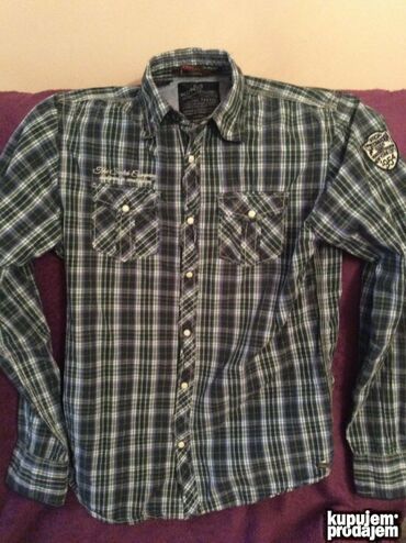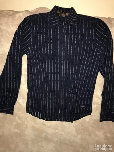- Košulja 4: tamnoplava karirana (belo-sivi kvadrati), dug rukav, button-down kragna, kopčanje na dugmad, mala izvezena oznaka na levoj strani grudi.