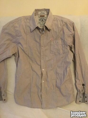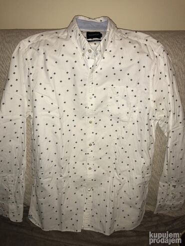 - Košulja 2: bela sa sitnim tamnim dezenom (rombi), dug rukav, džep na levoj strani grudi, button-down kragna, kompletno kopčanje napred.