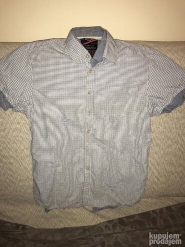 - Košulja 3: kratki rukav, sitna plavo-bela kockica (karirani „gingham“ dezen), klasična kragna, džep na levoj strani grudi, kopčanje na dugmad.