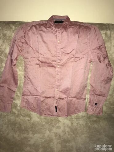 - Košulja 1: svetloružičasta, dug rukav, klasična kragna, kopčanje na dugmad po sredini, diskretna etiketa pri dnu, manžetne sa dugmetom.