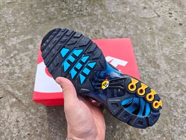 - Ikonični Air Max Plus dizajn sa talasastim TPU ojačanjima preko mrežastog gornjišta u plavo‑crnim nijansama