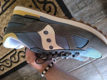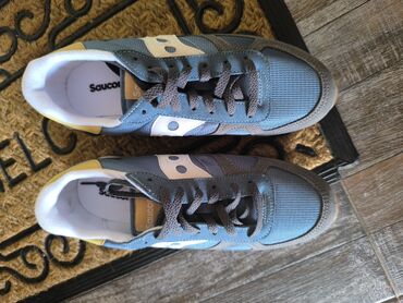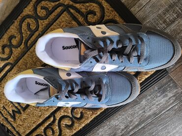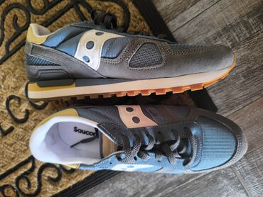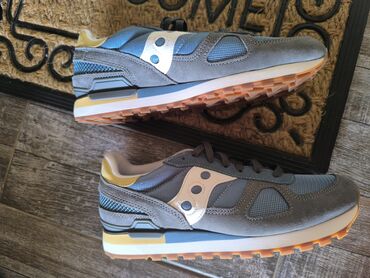 - Boje: sivo-plava gornjišta sa belim Saucony logom; detalji u žutoj; đon narandžaste boje sa belim međudžonom
