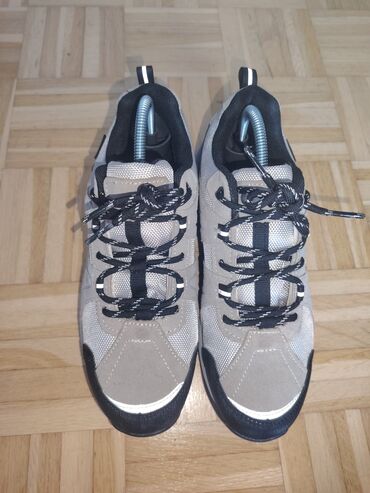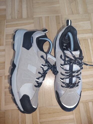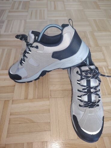 Patike za planinarenje u sivim i crnim tonovima, dizajnirane za aktivnosti na otvorenom. UG 25cm. Imaju ojačani prednji deo za dodatnu izdržljivost i zaštitu, kao i robustan đon sa dubokim šarama za bolje prianjanje na različitim terenima. Pertle su crne sa belim detaljima, pružajući sigurno vezivanje. Idealne su za planinarenje, šetnje po prirodi i druge avanture.