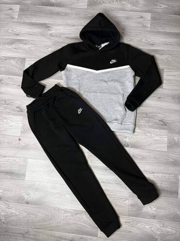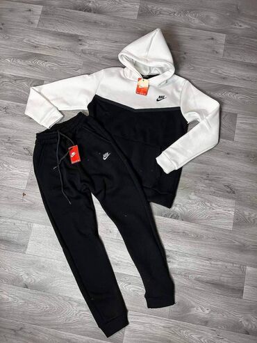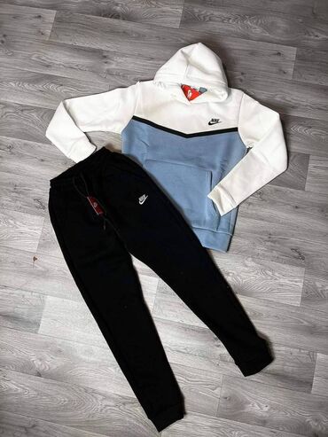 Muški komplet trenerki – dva modela 1) Nike komplet: - Gornji deo na rajsferšlus, visoka kragna - Boje: crna sa plavim ramenima i belim detaljima/linijama - Diskretni Nike Swoosh logotipi na jakni...